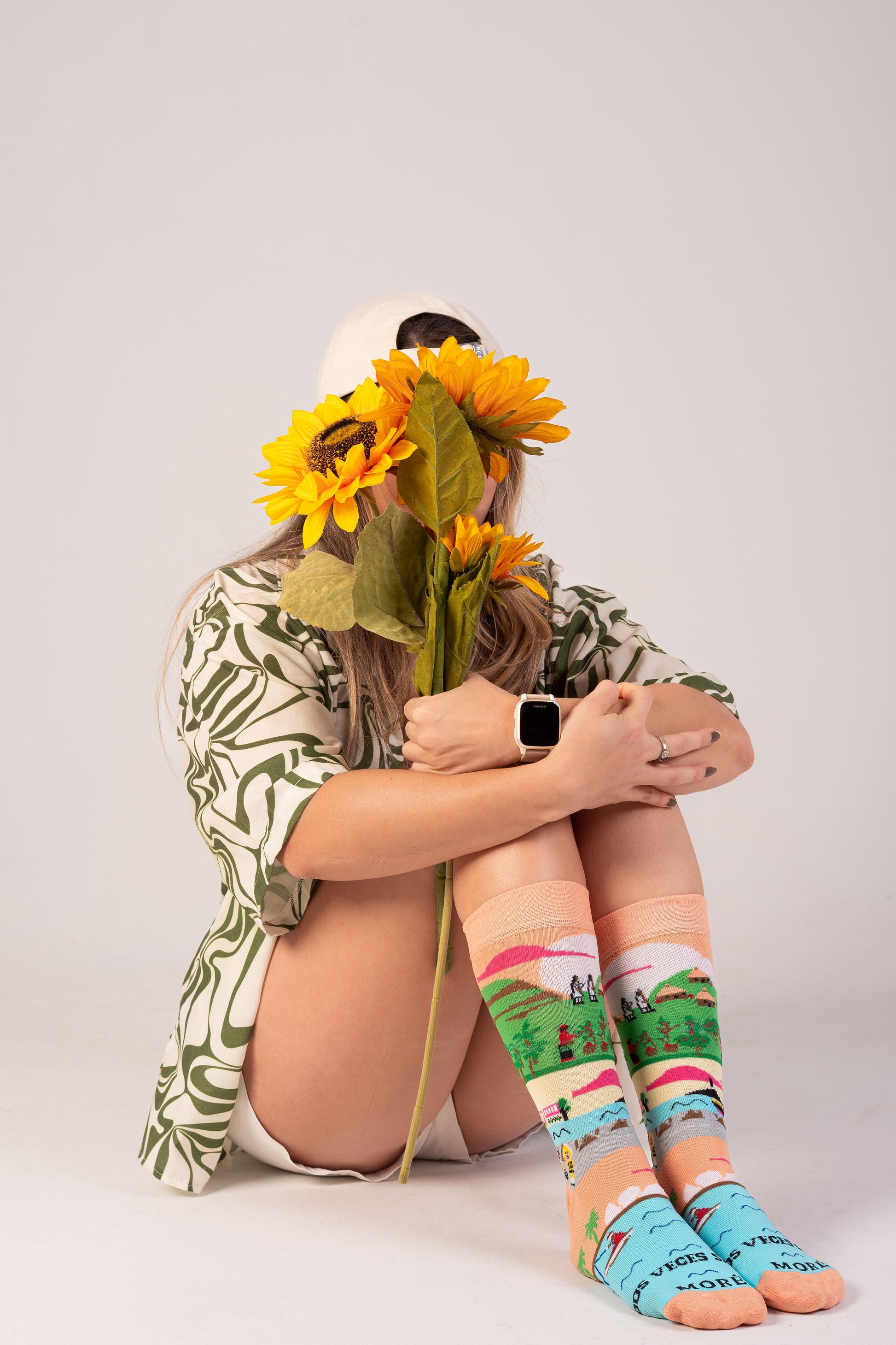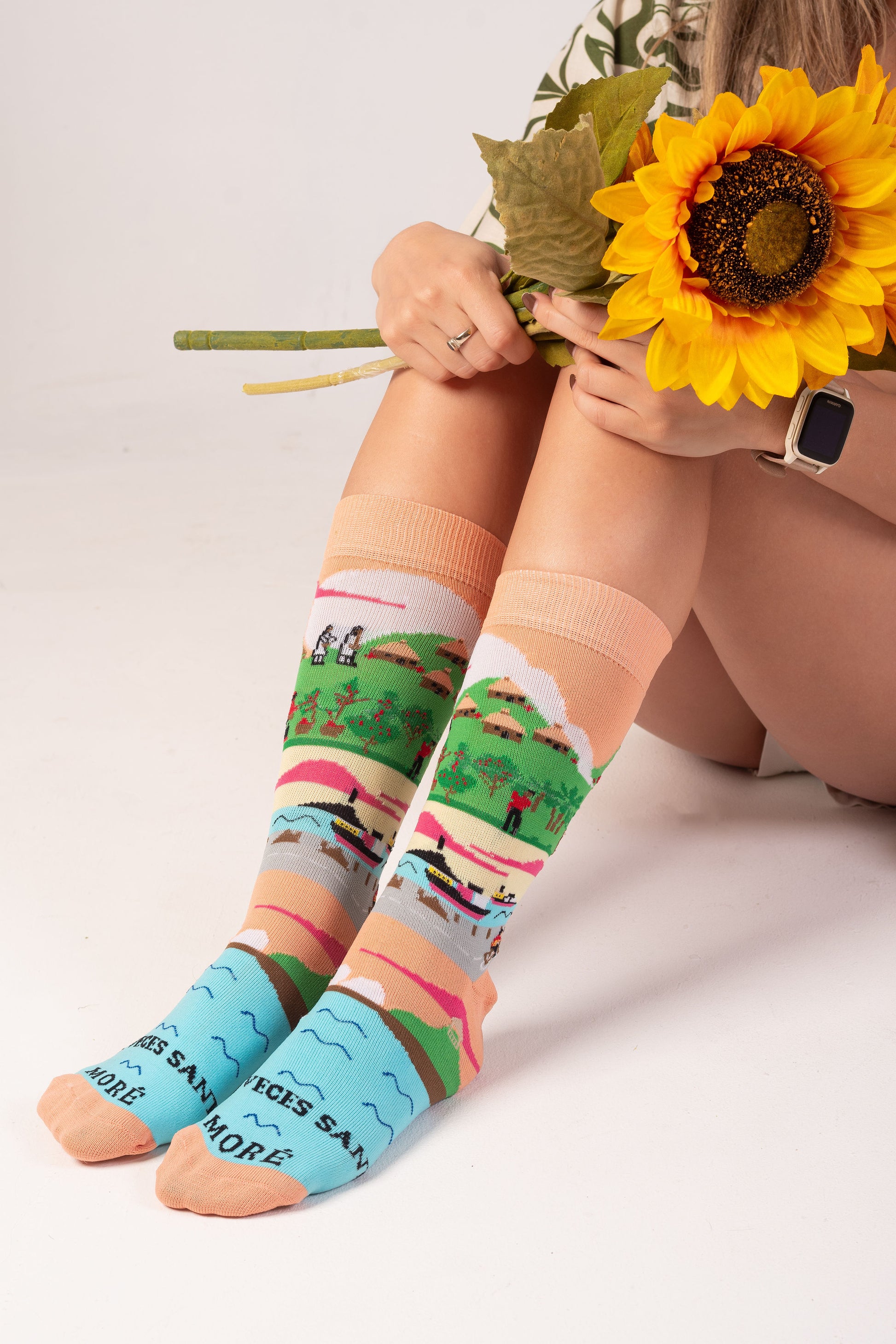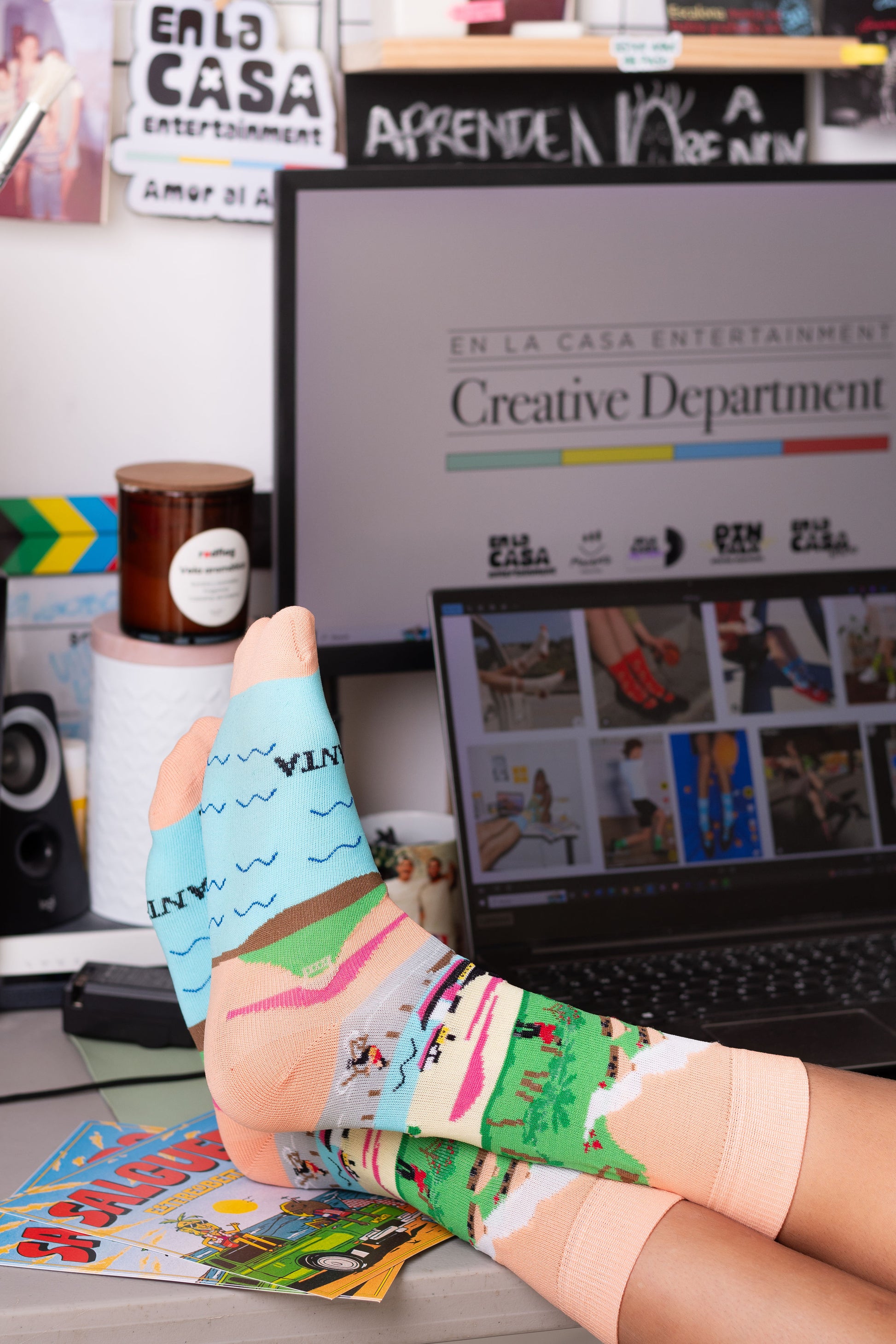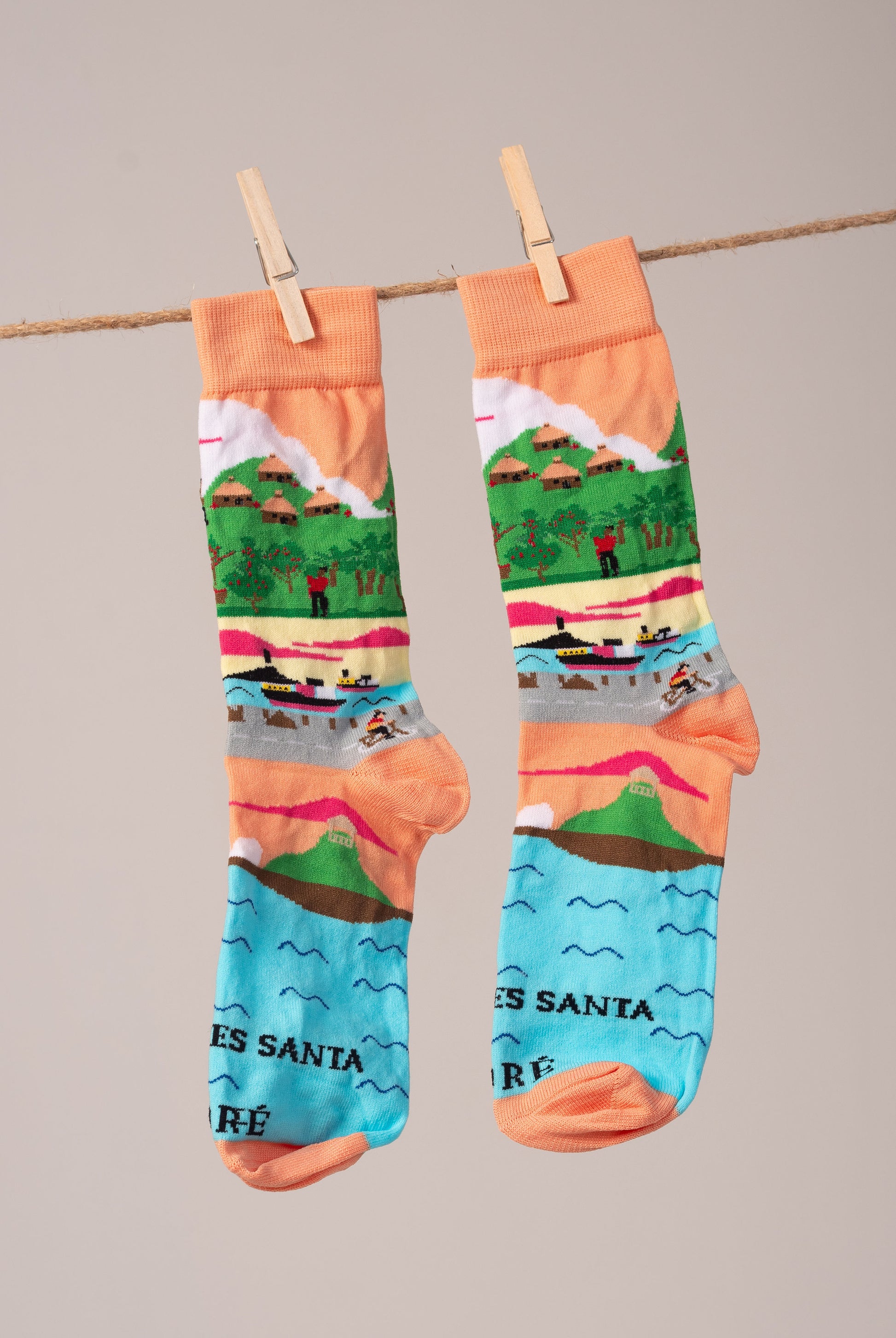 Este diseño rinde homenaje a su legado, sus playas, su gente cálida y su imponente Sierra Nevada. Inspirado en los colores vibrantes del Caribe, las olas del mar, y los paisajes que enmarcan la ciudad, cada par de medias es un tributo a la rica herencia cultural y natural de Santa Marta. Los detalles de los elementos autóctonos y la mezcla de tradiciones locales se reflejan en cada trazo, recordando que esta ciudad es el alma del Caribe colombiano.