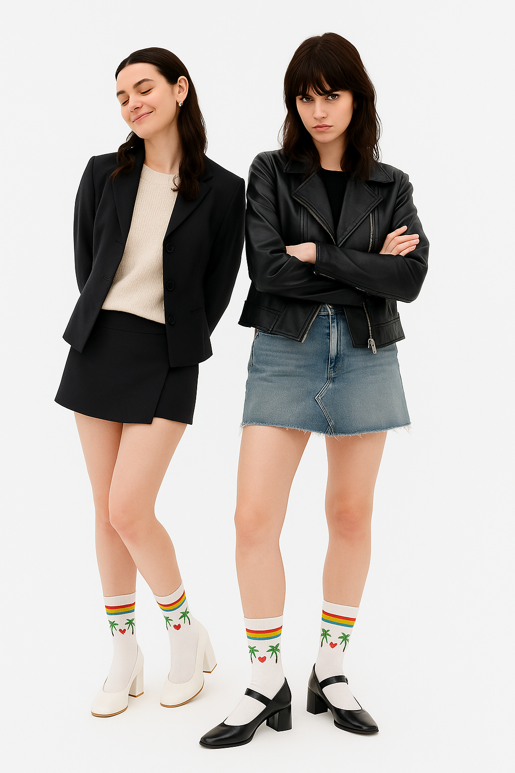 Nuestras medias cortas Rainbow Palm combinan la alegría de los colores del arcoíris con el encanto relajado de las palmeras y un corazón que te invita a llevar siempre un pedacito de verano contigo. Cómodas, frescas y con mucho estilo, son perfectas para quienes viven la vida con energía, libertad y un espíritu playero que nunca se apaga