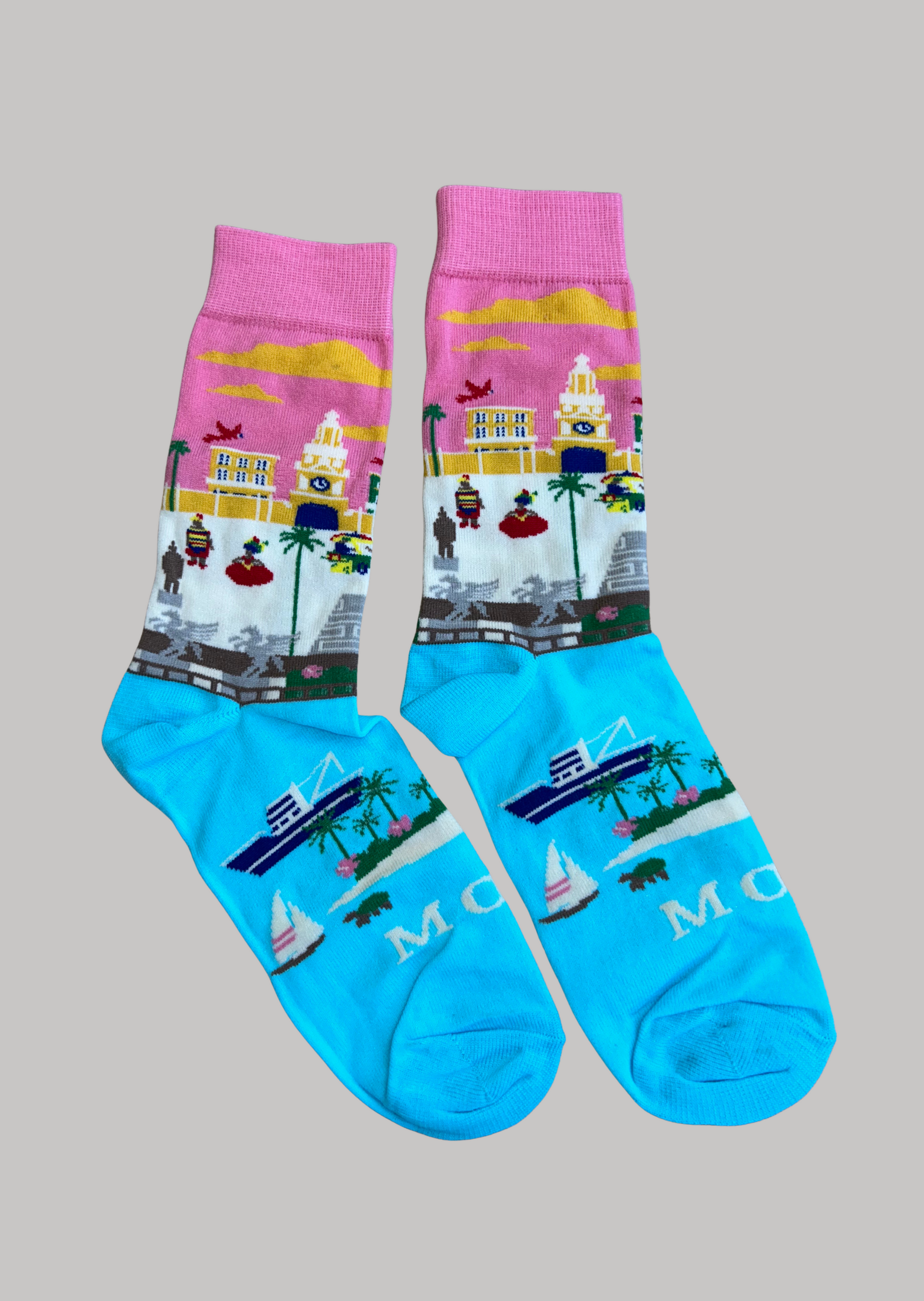 Lleva en tus pasos la magia y el encanto de la ciudad amurallada. Nuestras medias de Cartagena capturan la esencia de sus calles coloridas, la imponente Torre del Reloj, las murallas históricas y el mar Caribe que la abraza. Con un diseño vibrante y lleno de detalles, estas medias son perfectas para quienes aman viajar, recordar y contar historias a través de lo que usan.